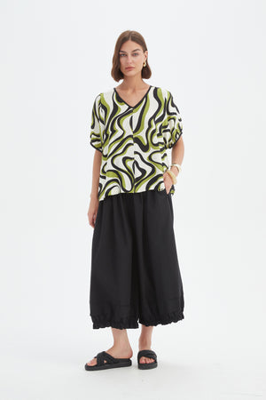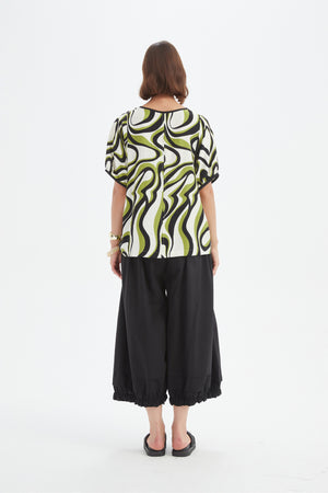 Refined yet effortless, the Bishop Sleeve Swirl Top is designed to move with you. Crafted from a soft, drapey blend, it features a flattering V-neckline and elegant bishop sleeves that gather softly at the cuffs. The relaxed silhouette ensures comfort without compromising style, while the black trim at the neckline and cuffs adds a subtle, modern contrast.