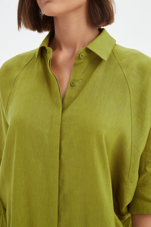 Effortless sophistication meets relaxed ease in the Oversized Linen Shirt Dress. Crafted from lightweight linen, it features a classic collar, hidden placket, and cuffed 1/2 sleeves, balancing structure with comfort. Its ovoid shape and convenient pockets add subtle functionality, while its versatile design allows you to wear it on its own as a breezy dress or layered over pants for a modern, relaxed silhouette