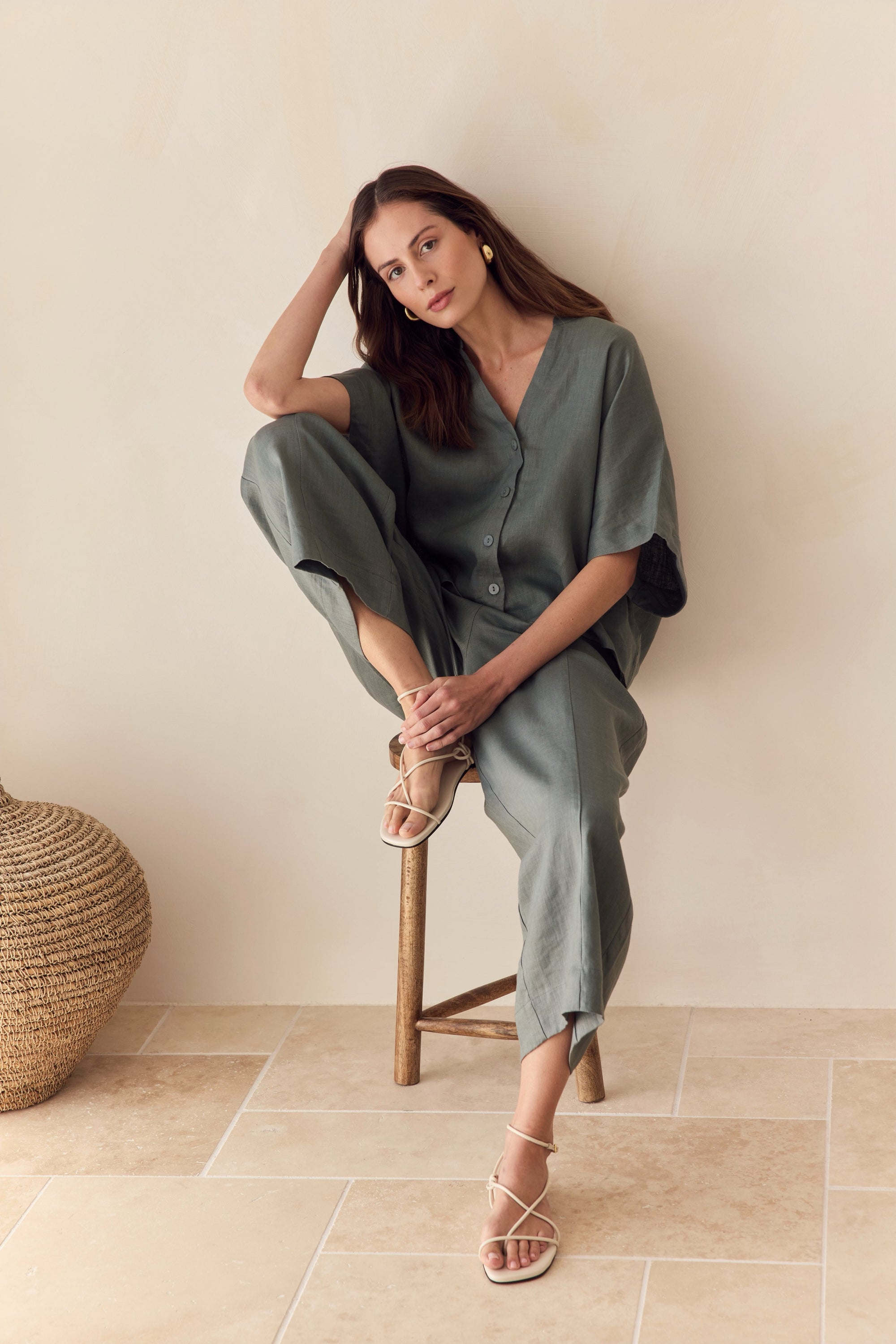 A modern take on the classic linen shirt, the Boxy Button Linen Shirt features a relaxed silhouette, notch neckline, and short wide sleeves. Its slightly cropped length makes it ideal for pairing with high-waisted pants or skirts, while wearing it buttoned up or layered open offers effortless versatility for day-to-day styling.