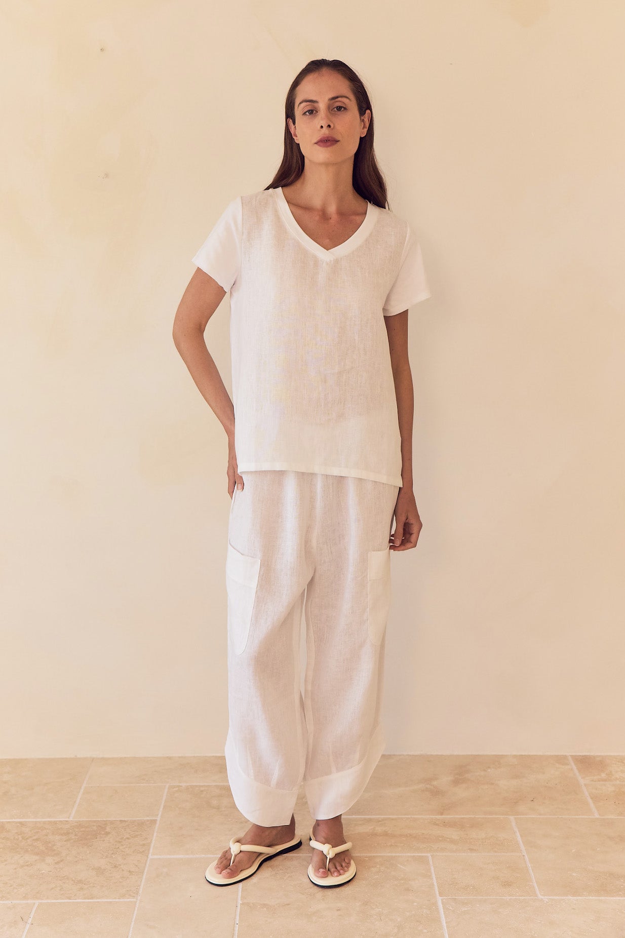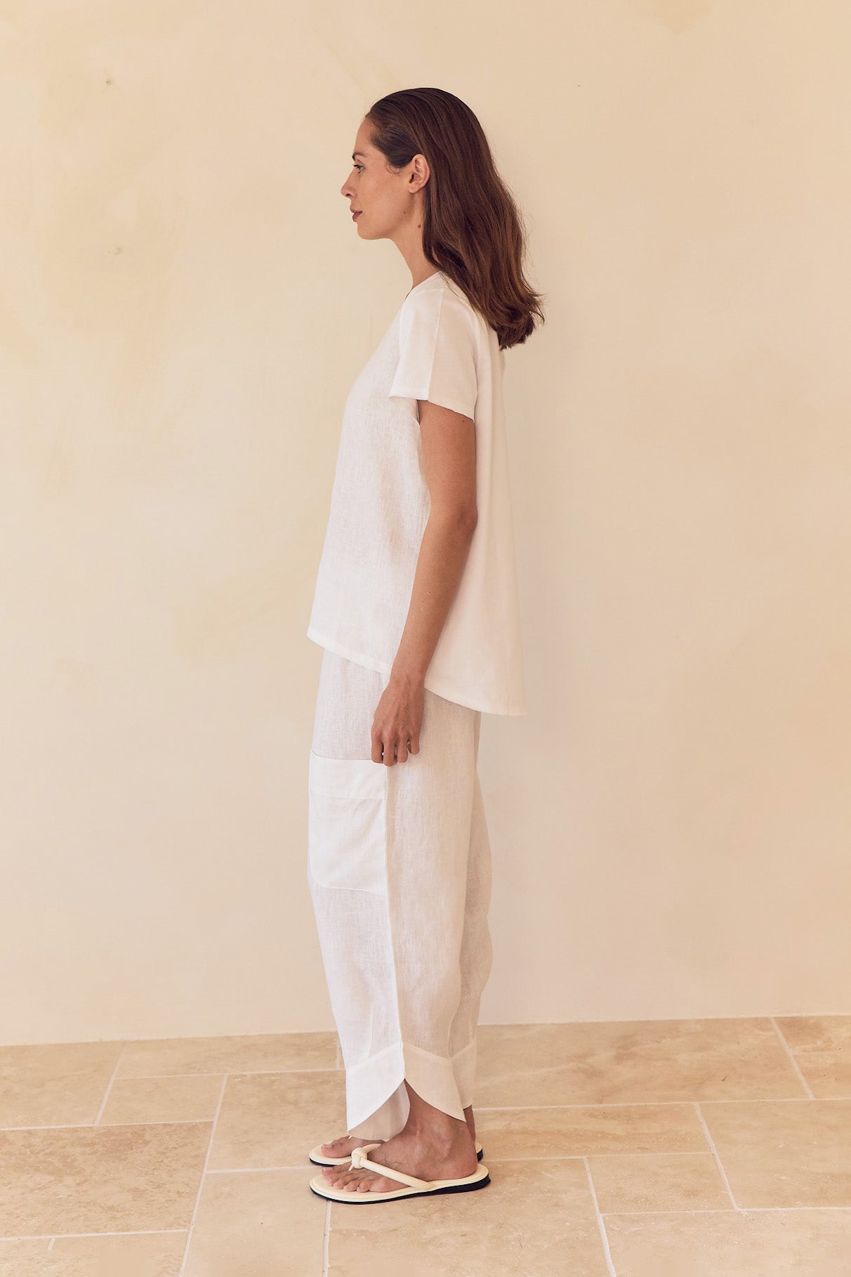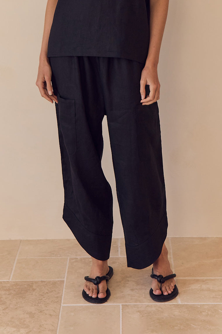 Effortless, relaxed ease defines the Casual Linen Pants. Crafted from 100% French Linen, these cropped pants feature an elasticated waistband, patch pockets, a curved hem with deep cuffs, and a loose silhouette. Perfect for pairing with tees, tank tops, or lightweight layers, they’re ideal for sunlit days, weekend wanderings, or laid-back summer living.