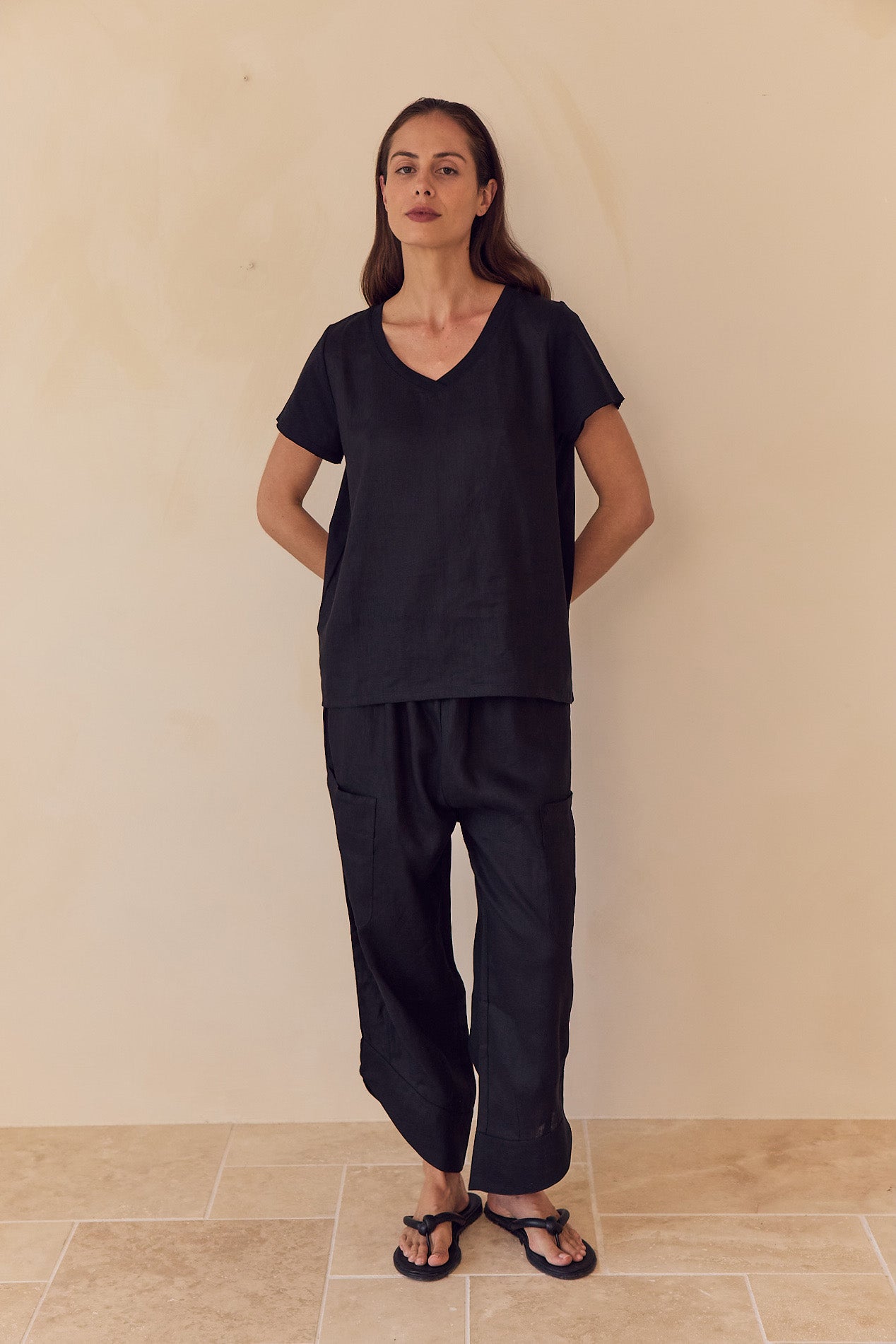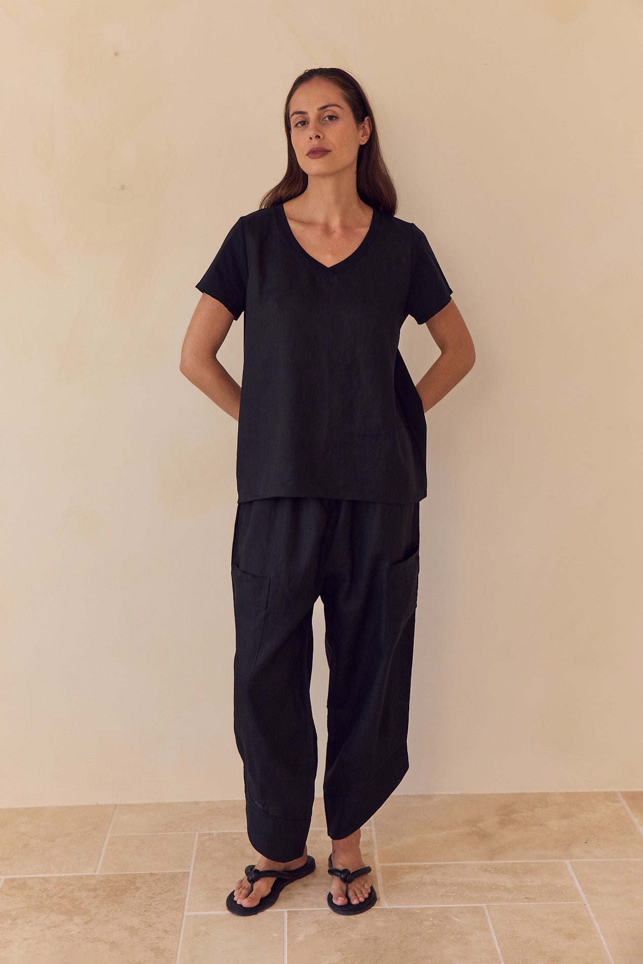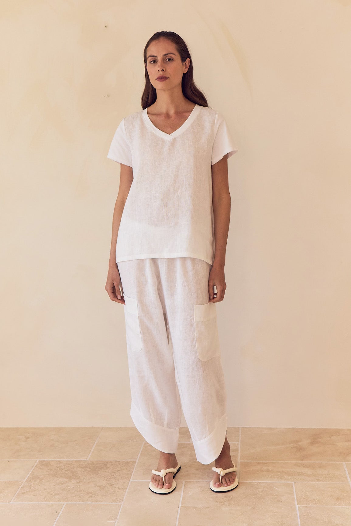 Effortless, relaxed ease defines the Casual Linen Pants. Crafted from 100% French Linen, these cropped pants feature an elasticated waistband, patch pockets, a curved hem with deep cuffs, and a loose silhouette. Perfect for pairing with tees, tank tops, or lightweight layers, they’re ideal for sunlit days, weekend wanderings, or laid-back summer living.