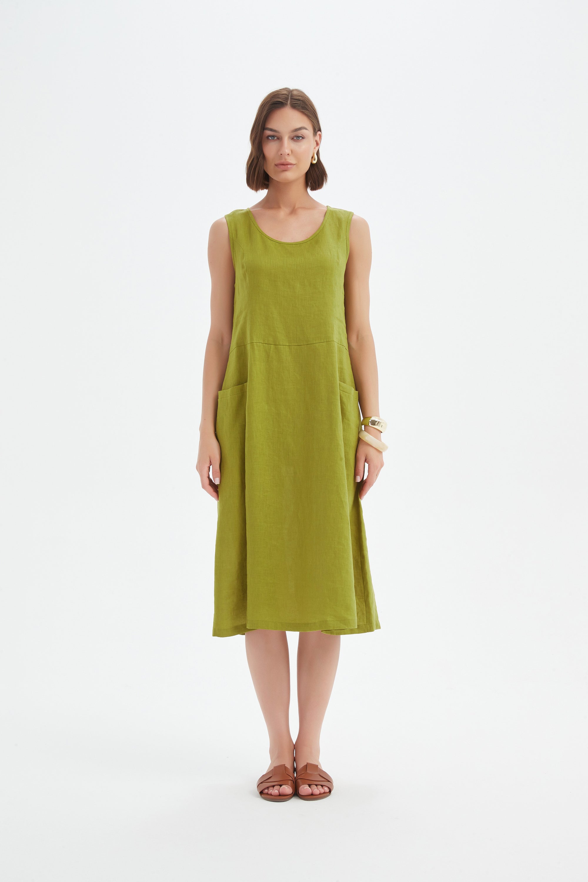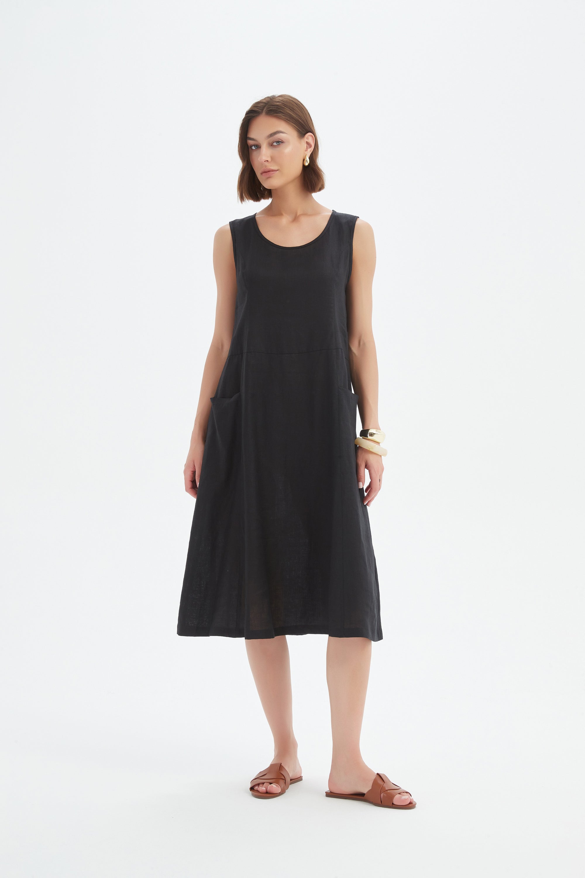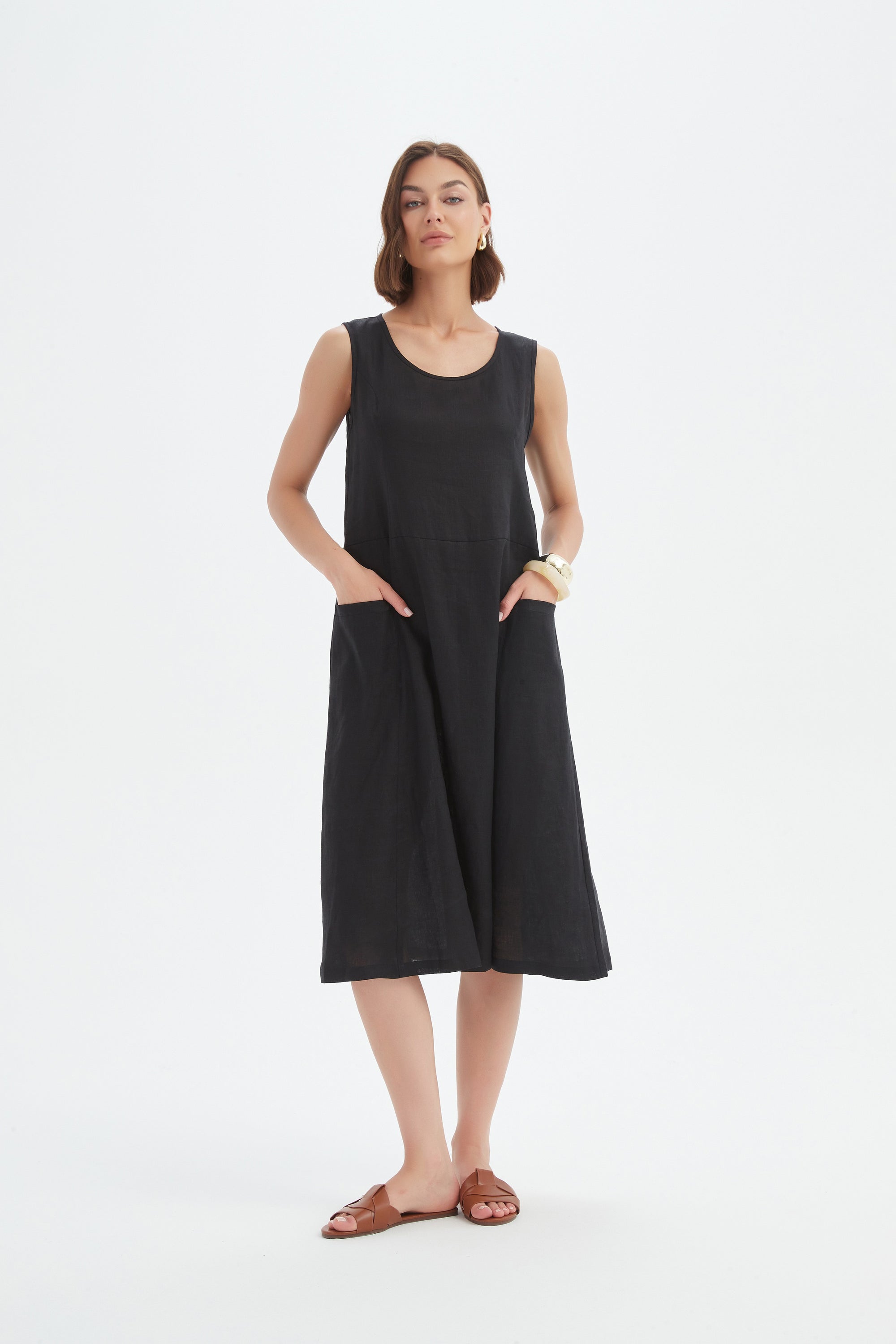 Light, airy, and effortlessly chic, the Sleeveless Pocket Dress is a summer wardrobe essential. Crafted from 100% French Linen, it features a scoop neckline, structured princess seams, and a flattering A-line silhouette that skims the body. Practical pockets add functional elegance, making this dress perfect for easy summer dressing.