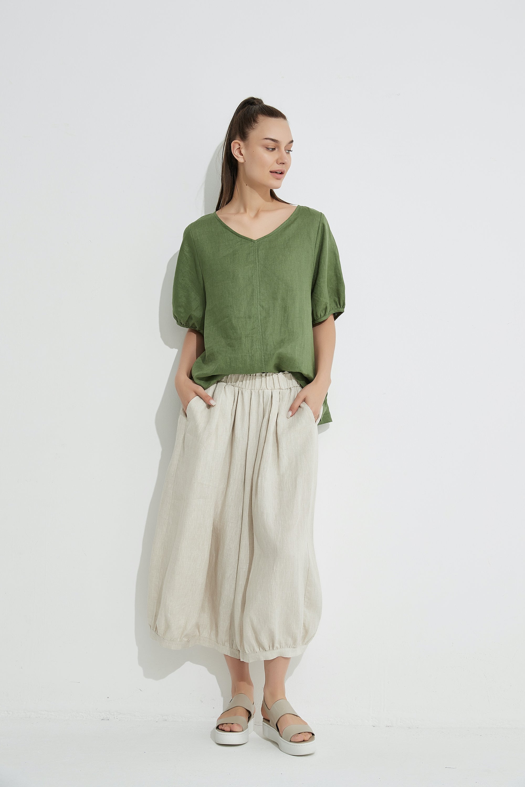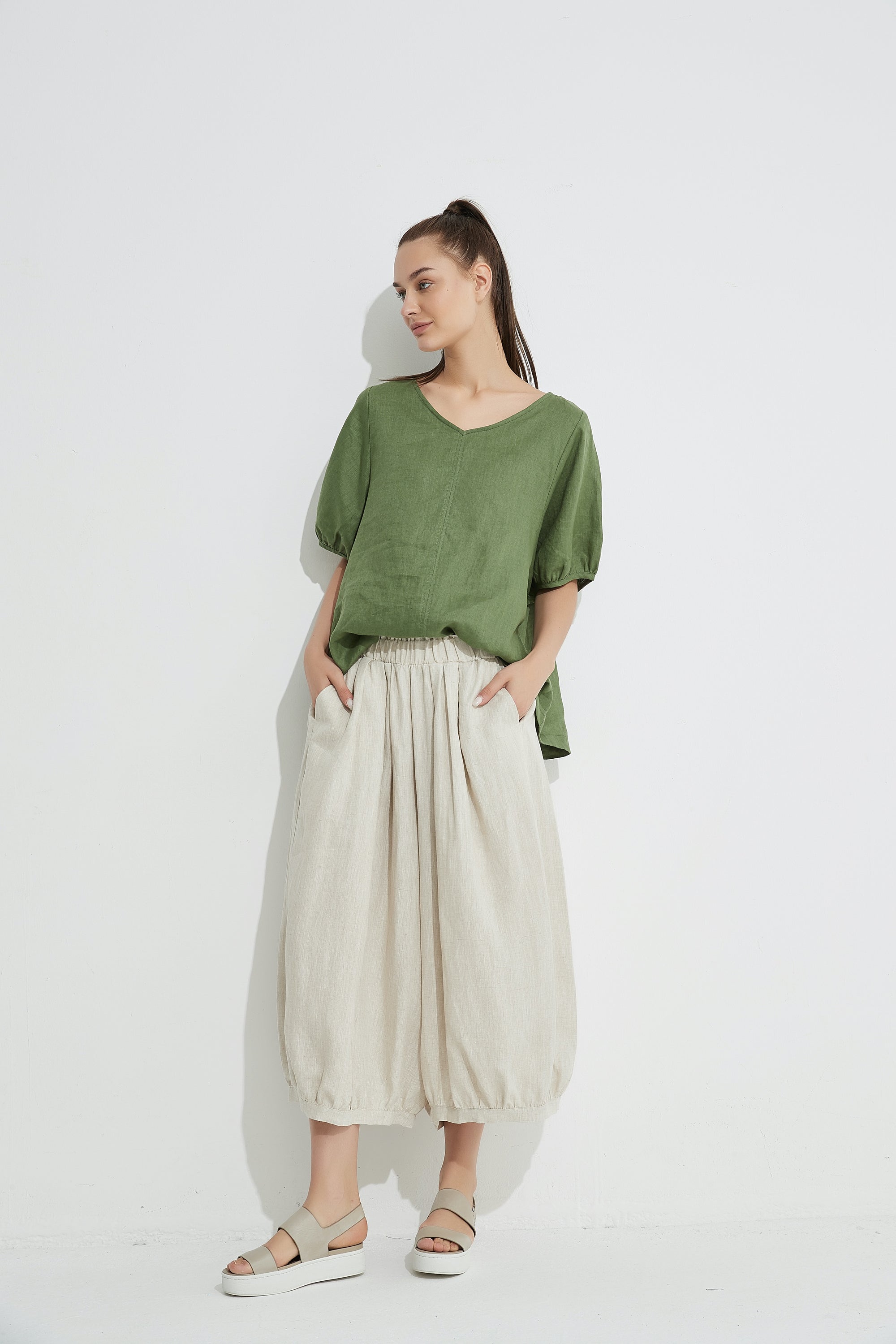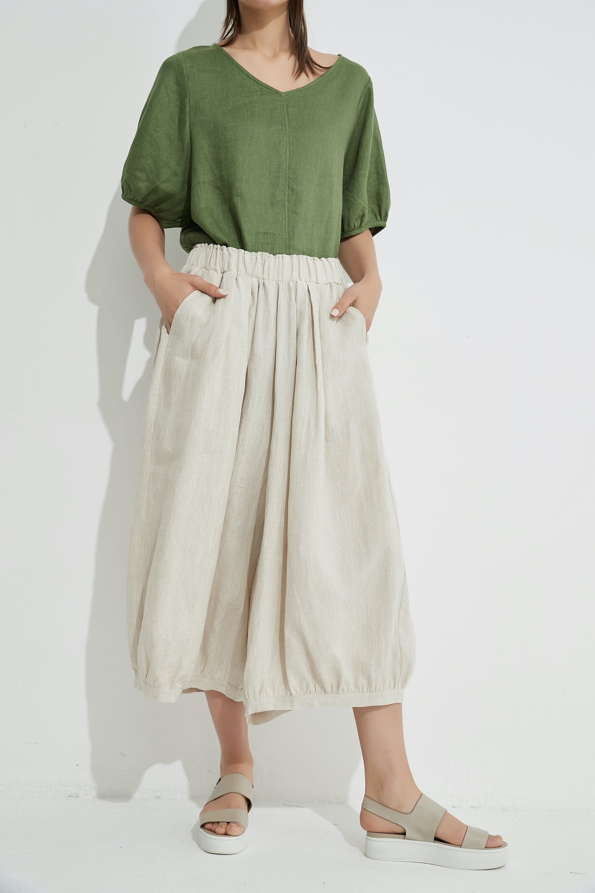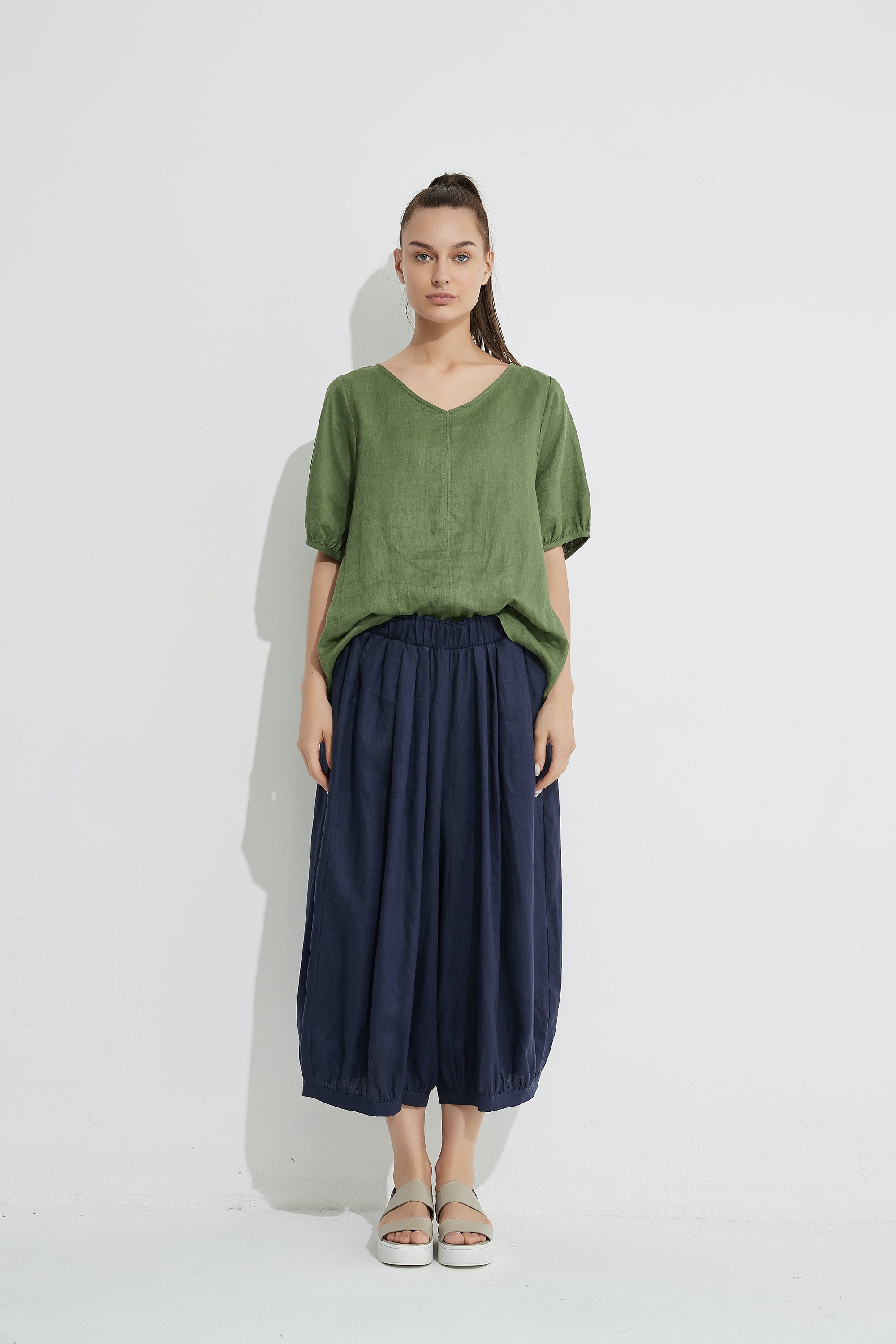 Crafted from soft wash linen, the Billow Pants have heavy gathers which fall to the mid-calf and finish with a band on the hem. With an elastic paper-bag waist, a deep crotch and a side pocket, these unique yet comfortable pants will complete your outfits all summer long.