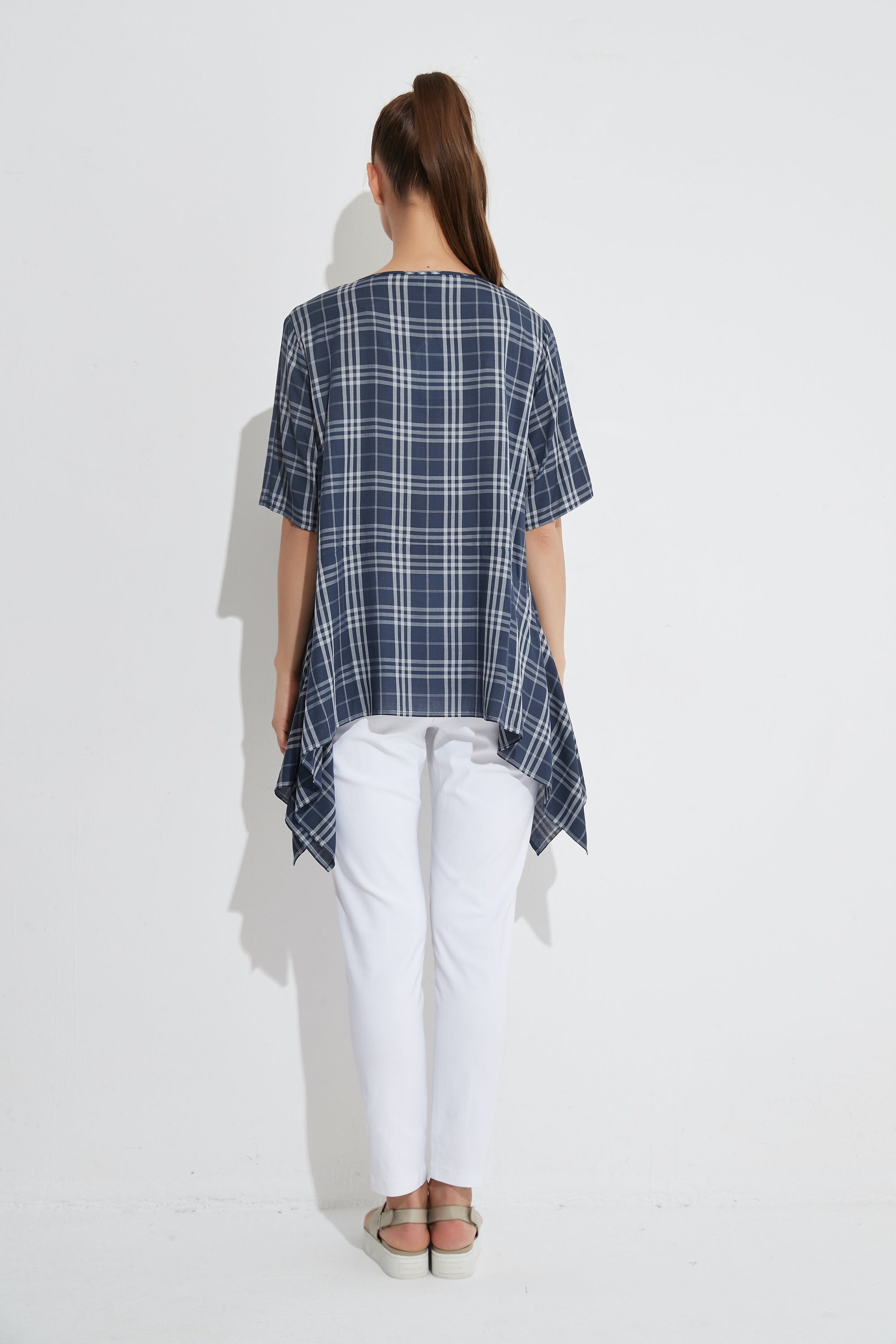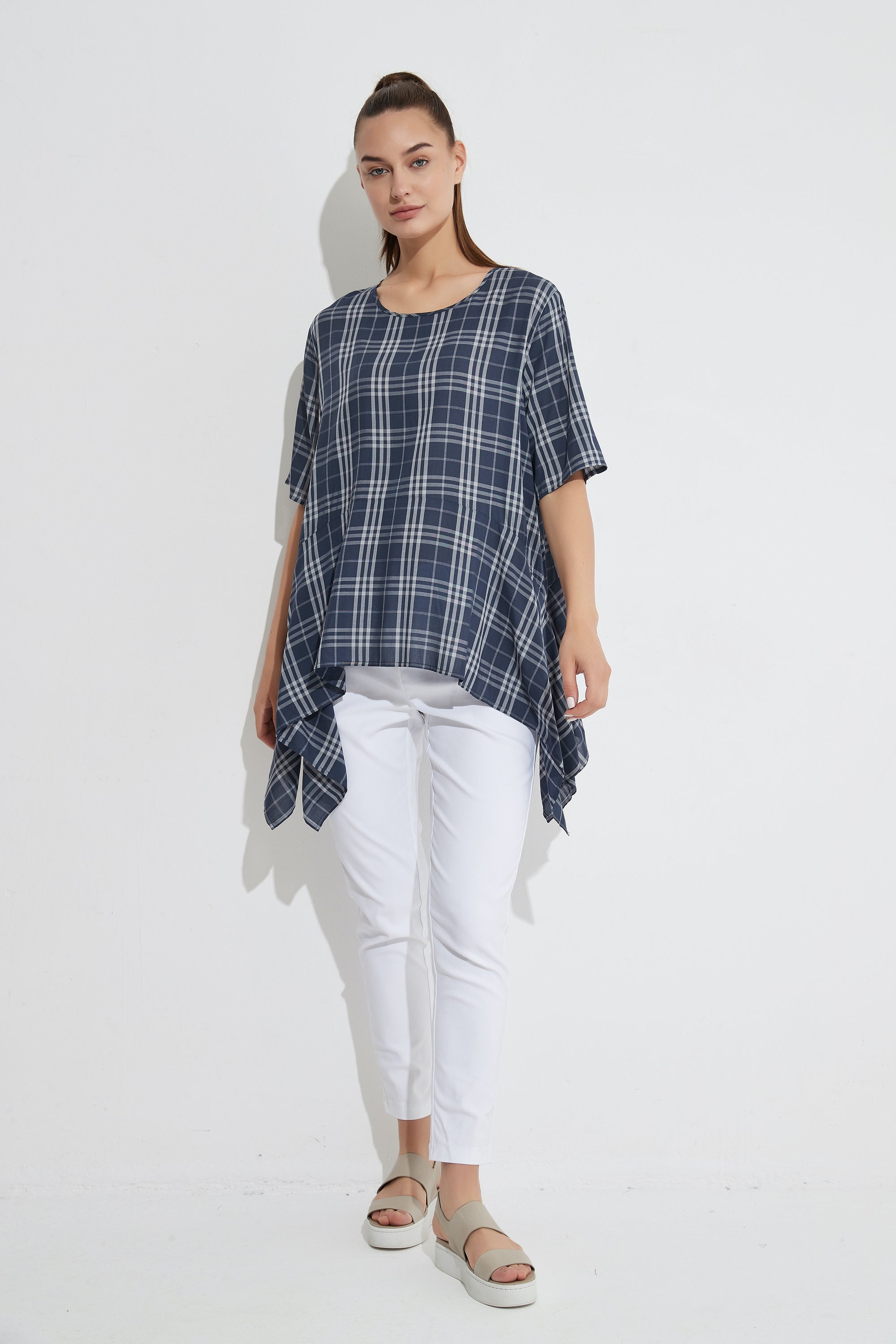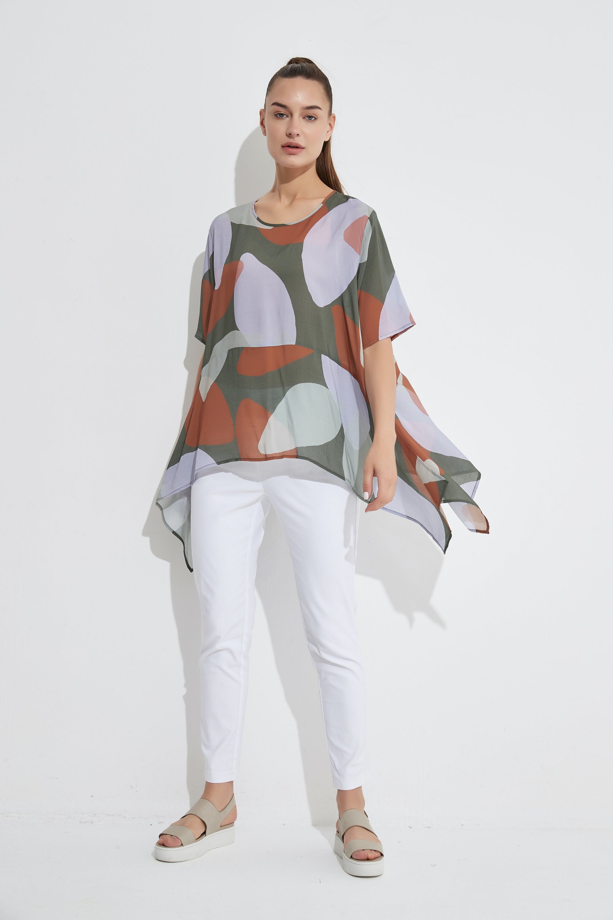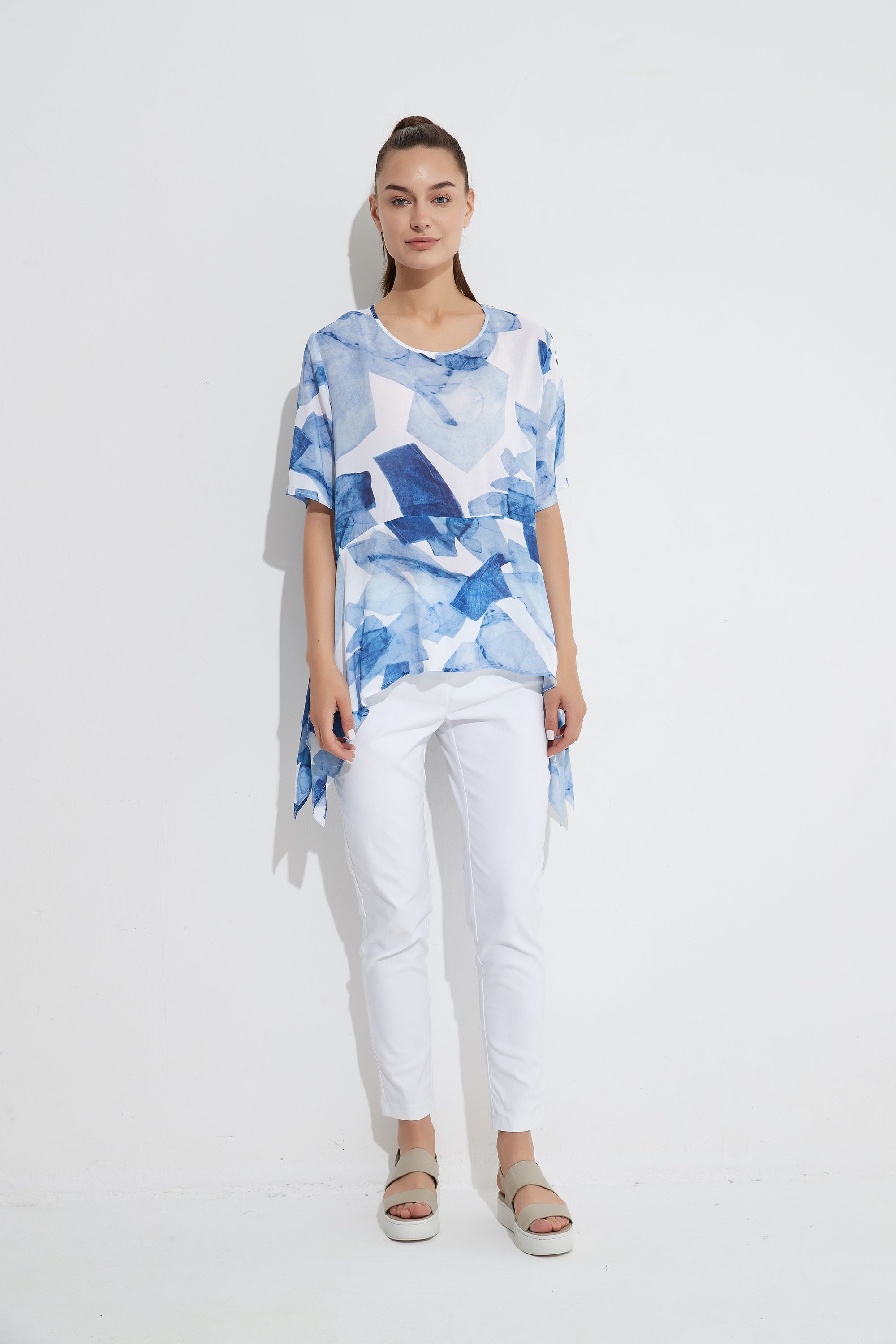 Crafted from a soft, luxurious, printed rayon fabrication. It features a scoop neck and a curved hemline creating long sides that move with the body. The fit is loose and comfortable to wear.