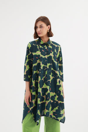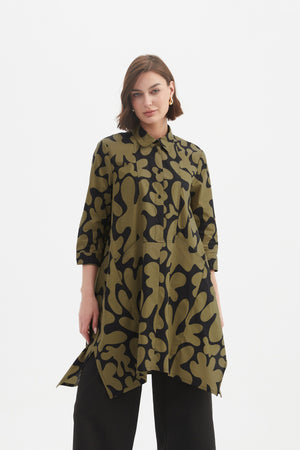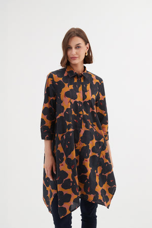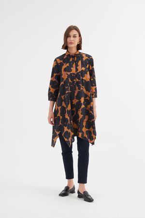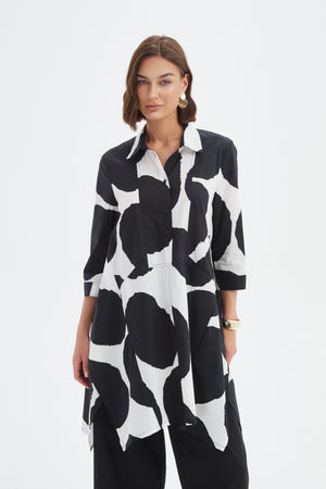 Introducing our Handkerchief Hem Print Shirt. This longline, printed shirt features a unique hanky hem, a half placket, and buttoned arm cuffs. With 3/4 sleeves and convenient pockets, it combines modern style with everyday practicality. Perfect for any occasion, it’s a versatile addition to your wardrobe.