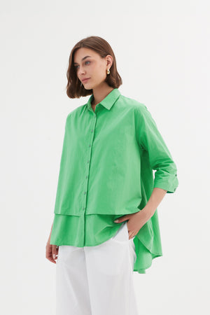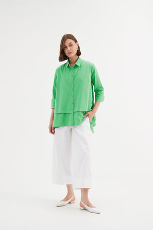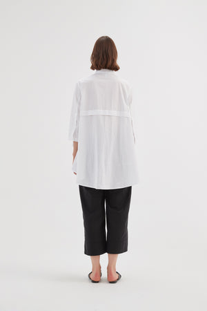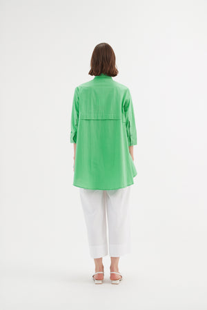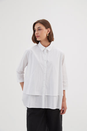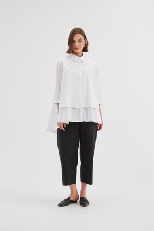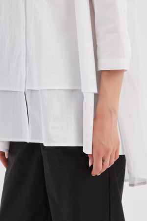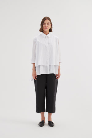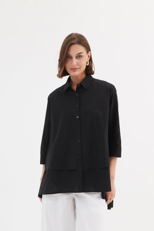 The Tiered Front Shirt combines timeless style with a modern twist. Its classic collar and 3/4 sleeves offer an elegant foundation, while the tiered front and swing hem add fluidity and movement. Completed with buttoned arm cuffs, this piece strikes the perfect balance between classic and contemporary.